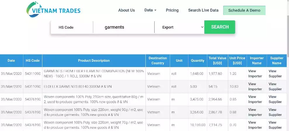 Not only can you get the names of suppliers and manufacturers by HS Code, you can also get pricing information including actual payment terms and unit-prices paid by importers. This can give you a fair range of prices and payment terms when negotiating with other suppliers in Vietnam.